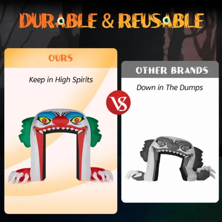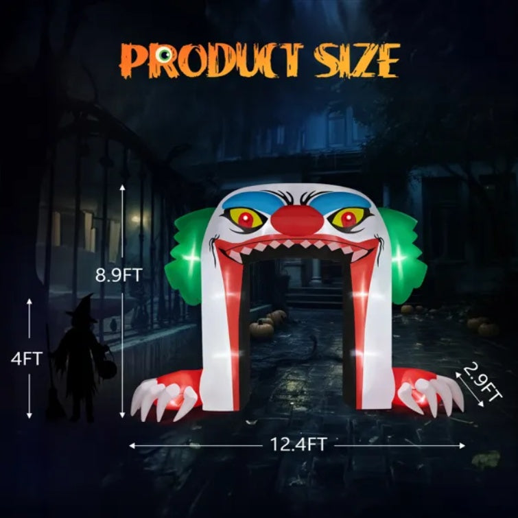 Transform your yard into a spooky spectacle with our 8.9 FT Halloween Inflatable Clown Archway. This giant, eye-catching decoration features detailed facial features, a terrifying smile and menacing claws, perfect for creating a mysterious and eerie atmosphere. Ideal for holiday parties and front yard displays, this inflatable archway will be the highlight of your neighborhood, attracting guests, friends, and trick-or-treaters alike.